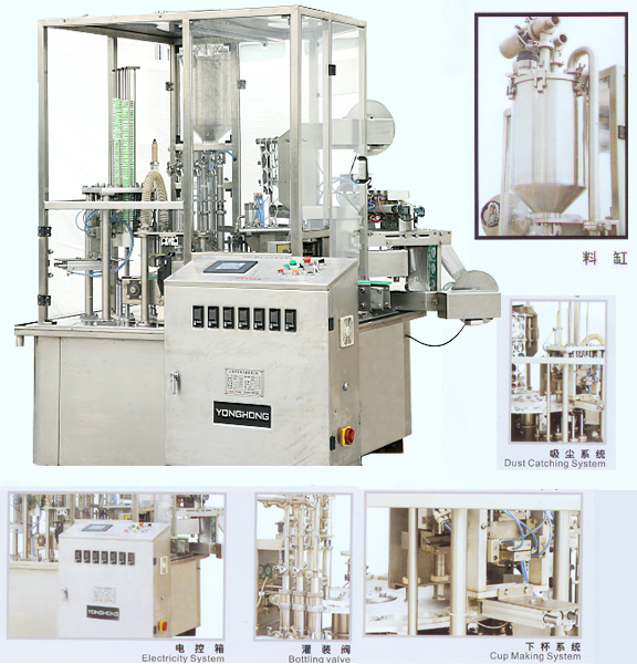 本機器是專為紙杯、塑料杯而設計的灌裝封口機,集機械手下杯、頂杯灌裝、制蓋、封口、卷邊等為一體的自動化設備,可灌裝果粒,采用進口氣動原件,人機界面控制,具有占地面積小、自動化程度高等優(yōu)點。
