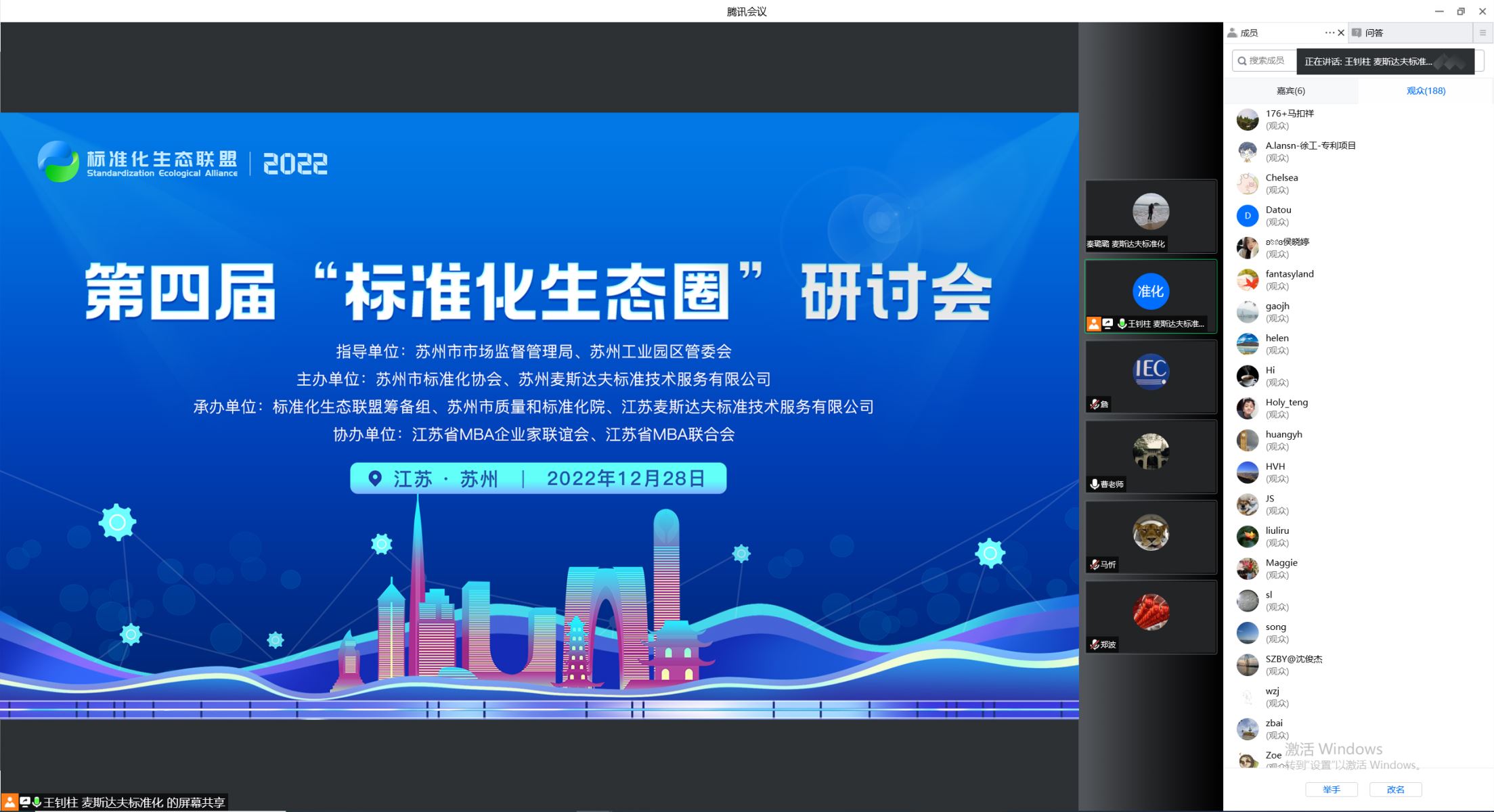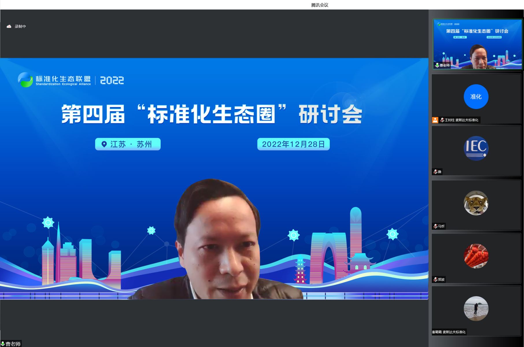 2022年12月28日,由麥斯達(dá)夫發(fā)起的第四屆“標(biāo)準(zhǔn)化生態(tài)圈”研討會在蘇州舉辦,會議以線上線下相結(jié)合的形式召開。本屆“標(biāo)準(zhǔn)化生態(tài)圈”研討會在蘇州市市場監(jiān)督管理局、蘇州工業(yè)園區(qū)管委會的指導(dǎo)下,由蘇州市標(biāo)準(zhǔn)化協(xié)會、蘇州麥斯達(dá)夫標(biāo)準(zhǔn)技術(shù)服務(wù)有限公司主辦,標(biāo)準(zhǔn)化生態(tài)聯(lián)盟籌備組、蘇州市質(zhì)量和標(biāo)準(zhǔn)化院、江蘇麥斯達(dá)夫標(biāo)準(zhǔn)技術(shù)服務(wù)有限公司承辦。蘇州市市場監(jiān)督管理局調(diào)研員、蘇州市標(biāo)準(zhǔn)化協(xié)會理事長李平,蘇州市市場監(jiān)督管理局標(biāo)準(zhǔn)化管理處處長曹秀峰,蘇州市質(zhì)量和標(biāo)準(zhǔn)化院院長、蘇州市標(biāo)準(zhǔn)化協(xié)會秘書長沈俊杰出席會議,往屆標(biāo)準(zhǔn)化生態(tài)圈聯(lián)合發(fā)起單位代表、蘇州市標(biāo)準(zhǔn)化協(xié)會各理事單位和會員單位代表以及線上報(bào)名的來自全國各地政府、企業(yè)、高校、科研院所等共計(jì)一千三百余人參會,會議同步在“騰訊會議”和“蔻享學(xué)術(shù)”平臺實(shí)時(shí)直播。會議由麥斯達(dá)夫標(biāo)準(zhǔn)化市場總監(jiān)王釗柱主持。