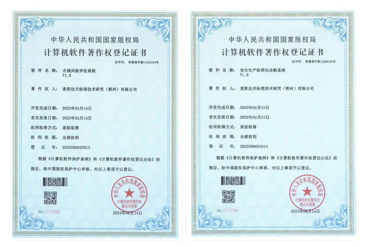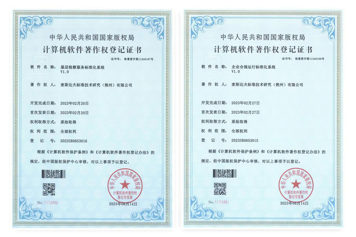 2023年6月16日,麥斯達夫標(biāo)準(zhǔn)技術(shù)研究 (朔州)有限公司獲得四項軟件著作權(quán)證書,“基層檢察服務(wù)標(biāo)準(zhǔn)化系統(tǒng)V1.0”“企業(yè)合規(guī)運行標(biāo)準(zhǔn)化系統(tǒng)V1.0”“合規(guī)風(fēng)險評估系統(tǒng)V1.0”“安全生產(chǎn)標(biāo)準(zhǔn)化診斷系統(tǒng)V1.0”。