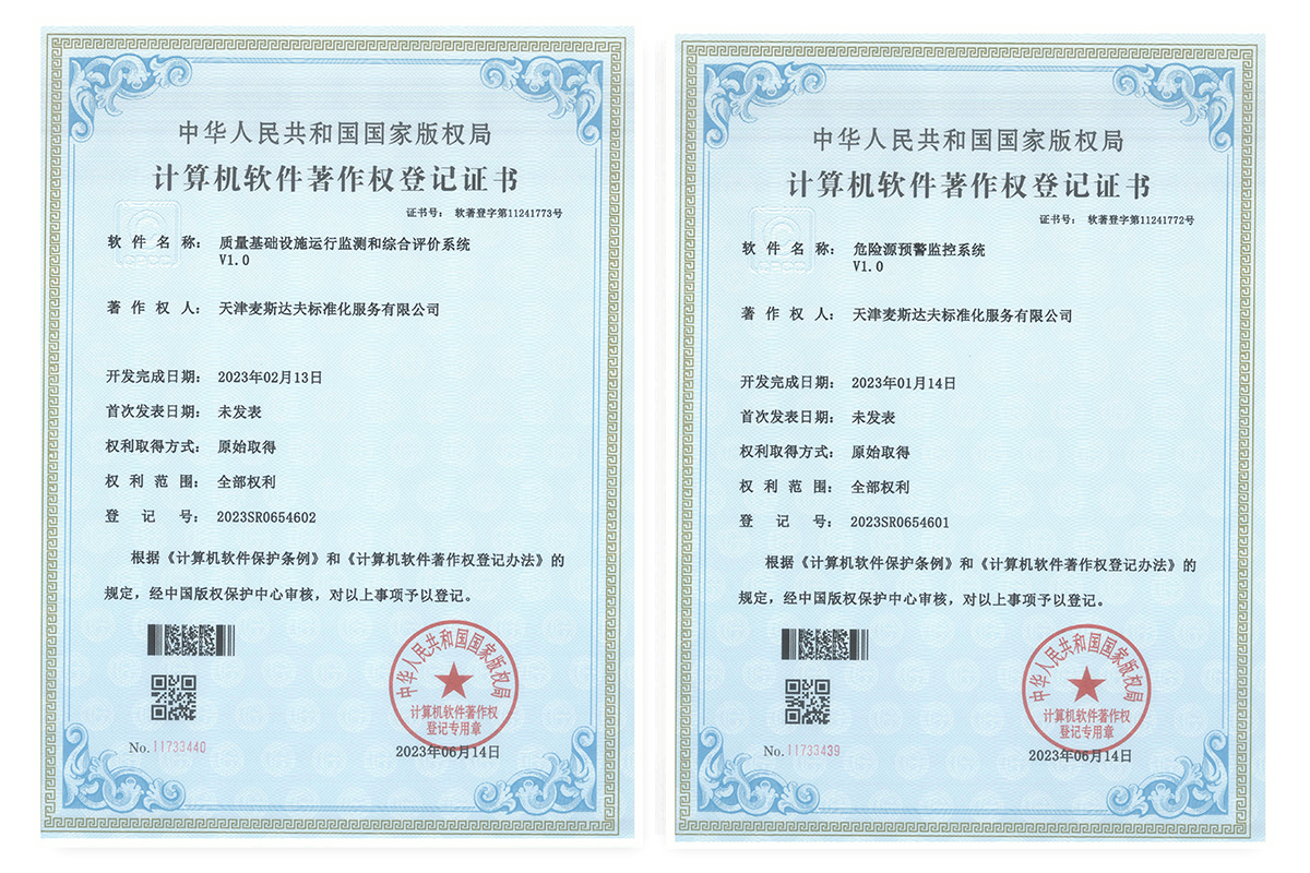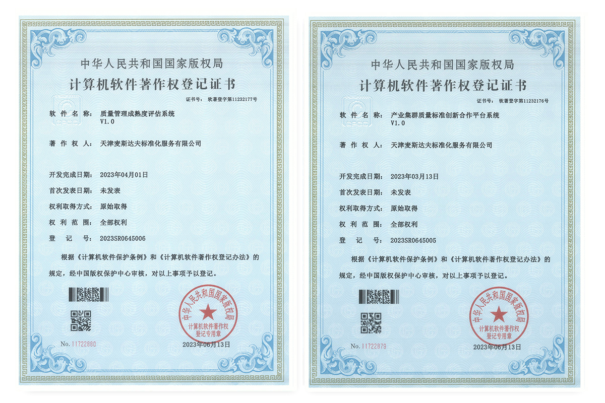 2023年6月16日,天津麥斯達(dá)夫標(biāo)準(zhǔn)化服務(wù)有限公司獲得四項(xiàng)軟件著作權(quán)證書,“質(zhì)量基礎(chǔ)設(shè)施運(yùn)行監(jiān)測(cè)和綜合評(píng)價(jià)系統(tǒng)V1.0”“危險(xiǎn)源預(yù)警監(jiān)控系統(tǒng)V1.0”“質(zhì)量管理成熟度評(píng)估系統(tǒng)v1.0”“產(chǎn)業(yè)集群質(zhì)量標(biāo)準(zhǔn)創(chuàng)新合作平臺(tái)系統(tǒng)v1.0”。