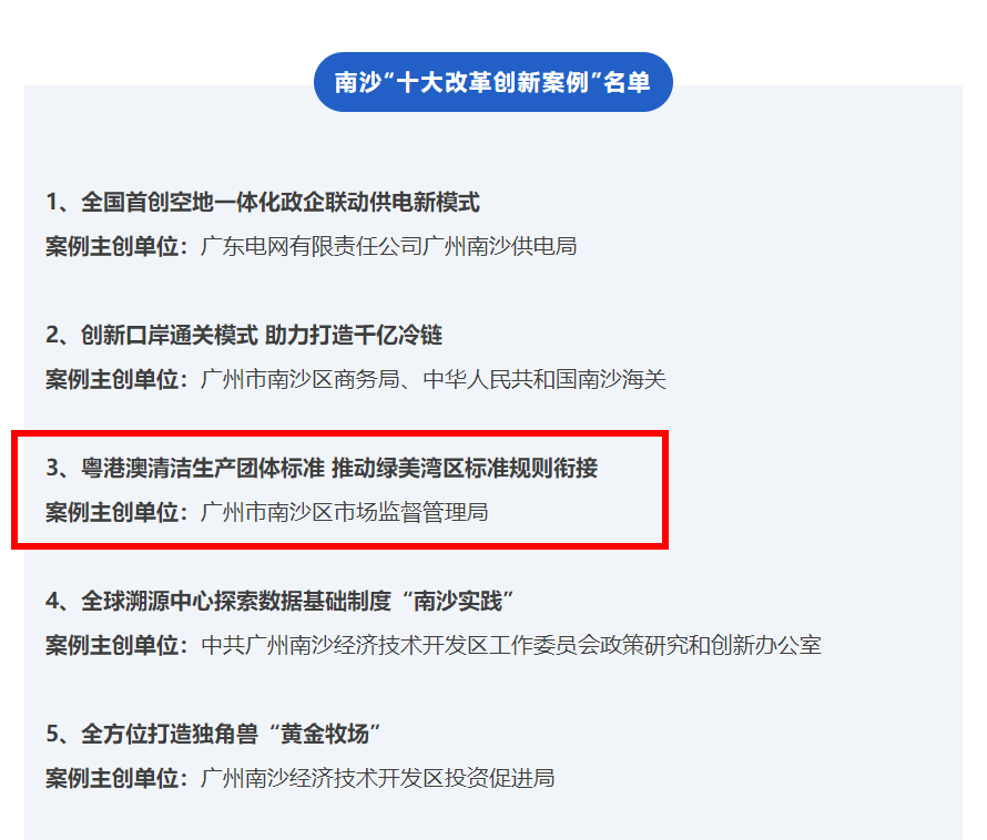 粵港澳清潔生產(chǎn)團(tuán)體標(biāo)準(zhǔn)入選廣州南沙十大改革創(chuàng)新案例