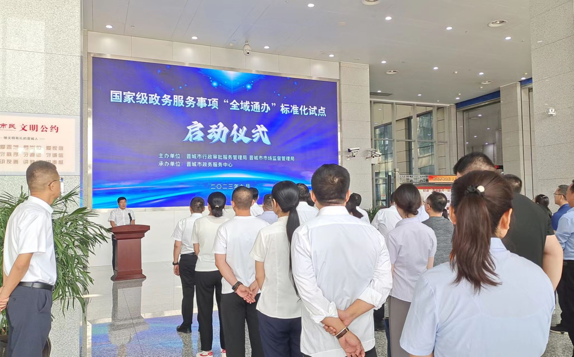 2023年9月5日,山西晉城政務服務事項“全域通辦”標準化試點啟動儀式在晉城市政務服務中心舉辦。市政府副秘書長,市行政審批服務管理局黨組書記、局長霍晉斌,市市場監(jiān)督管理局黨組書記、局長朱慧杰,市行政審批服務管理局黨組成員、市政務服務中心主任牛大偉,市市場監(jiān)督管理局三級調(diào)研員王勁等出席啟動儀式,各縣(市、區(qū))行政審批局局長、市行政審批局各業(yè)務科室科長、市市場監(jiān)管局相關業(yè)務科室科長、入駐政務大廳窗口代表等近百人參加活動。啟動儀式由市行政審批服務管理局黨組成員、副局長秦文峰主持。
