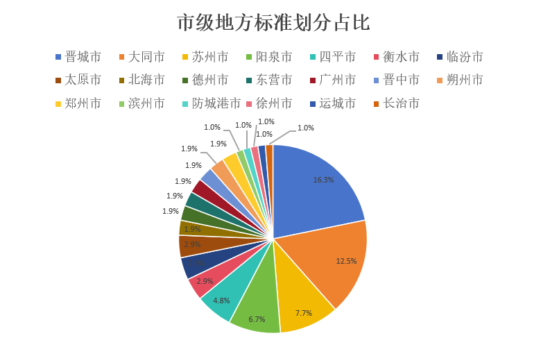 從省級(jí)行政區(qū)域來看,廣東、江蘇、山東、河南、河北、山西、廣西、吉林、海南等八個(gè)?。ㄗ灾螀^(qū))均有涉及。從市級(jí)行政區(qū)域來看,晉城市地方標(biāo)準(zhǔn)17項(xiàng),占比16.3%;大同市地方標(biāo)準(zhǔn)13項(xiàng),占比12.5%;蘇州市地方標(biāo)準(zhǔn)8項(xiàng),占比7.7%;陽泉市地方標(biāo)準(zhǔn)7項(xiàng),占比6.7%;四平市地方標(biāo)準(zhǔn)5項(xiàng),占比4.8%。此外,衡水、太原、臨汾各3項(xiàng),廣州、鄭州、北海、德州、東營(yíng)、晉中、朔州各2項(xiàng);徐州、濱州、防城港、長(zhǎng)治、運(yùn)城各1項(xiàng)。