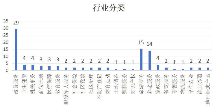 按照行業(yè)領(lǐng)域劃分,社會(huì)事業(yè)領(lǐng)域的地方標(biāo)準(zhǔn)61項(xiàng),占比58.7%;服務(wù)業(yè)領(lǐng)域的地方標(biāo)準(zhǔn)37項(xiàng),占比35.6%;農(nóng)業(yè)領(lǐng)域的地方標(biāo)準(zhǔn)6項(xiàng),占比5.8%。從行業(yè)分類來看,政務(wù)服務(wù)29項(xiàng)、衛(wèi)生健康4項(xiàng)、機(jī)關(guān)事務(wù)4項(xiàng)、商貿(mào)流通3項(xiàng)、醫(yī)療保障3項(xiàng)、教育服務(wù)3項(xiàng)、退役軍人服務(wù)2項(xiàng)、社會(huì)保險(xiǎn)2項(xiàng)、社區(qū)黨建2項(xiàng)、社區(qū)治理2項(xiàng)、不動(dòng)產(chǎn)登記2項(xiàng)、體育運(yùn)動(dòng)2項(xiàng)、土地儲(chǔ)備1項(xiàng)、殯葬服務(wù)1項(xiàng)、知識(shí)產(chǎn)權(quán)1項(xiàng);旅游服務(wù)15項(xiàng)、養(yǎng)老服務(wù)14項(xiàng)、家政服務(wù)4項(xiàng)、餐飲服務(wù)2項(xiàng),零售服務(wù)、物流服務(wù)各1項(xiàng);旱作農(nóng)業(yè)2項(xiàng)、漁業(yè)養(yǎng)殖2項(xiàng)、地理標(biāo)志產(chǎn)品2項(xiàng)。