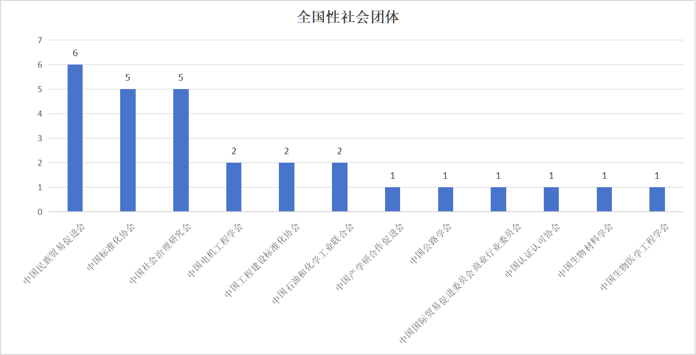 與14家全國(guó)性社會(huì)團(tuán)體合作,共計(jì)研制28項(xiàng)團(tuán)體標(biāo)準(zhǔn)。其中,中國(guó)民族貿(mào)易促進(jìn)會(huì)6項(xiàng)團(tuán)體標(biāo)準(zhǔn),中國(guó)標(biāo)準(zhǔn)化協(xié)會(huì)、中國(guó)社會(huì)治理研究會(huì)分別5項(xiàng)團(tuán)體標(biāo)準(zhǔn),中國(guó)工程建設(shè)標(biāo)準(zhǔn)化協(xié)會(huì)、中國(guó)石油和化學(xué)工業(yè)聯(lián)合會(huì)、中國(guó)電機(jī)工程學(xué)會(huì)分別2項(xiàng)團(tuán)體標(biāo)準(zhǔn),中國(guó)公路學(xué)會(huì)、中國(guó)產(chǎn)學(xué)研合作促進(jìn)會(huì)、中國(guó)國(guó)際貿(mào)易促進(jìn)委員會(huì)商業(yè)行業(yè)委員會(huì)、中國(guó)認(rèn)證認(rèn)可協(xié)會(huì)、中國(guó)生物材料學(xué)會(huì)、中國(guó)生物醫(yī)學(xué)工程學(xué)會(huì)分別1項(xiàng)團(tuán)體標(biāo)準(zhǔn)。