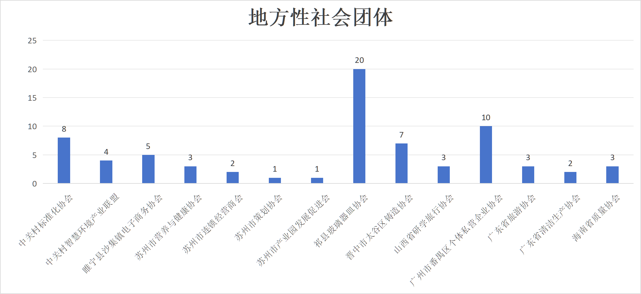 與12家地方性社會(huì)團(tuán)體合作,共計(jì)研制72項(xiàng)團(tuán)體標(biāo)準(zhǔn)。其中,在北京市的2家社會(huì)團(tuán)體研制12項(xiàng)團(tuán)體標(biāo)準(zhǔn),在江蘇省的5家社會(huì)團(tuán)體研制12項(xiàng)團(tuán)體標(biāo)準(zhǔn),在山西省的3家社會(huì)團(tuán)體研制30項(xiàng)團(tuán)體標(biāo)準(zhǔn),在廣東省的3家社會(huì)團(tuán)體研制15項(xiàng)團(tuán)體標(biāo)準(zhǔn),在海南省的1家社會(huì)團(tuán)體研制3項(xiàng)團(tuán)體標(biāo)準(zhǔn)。