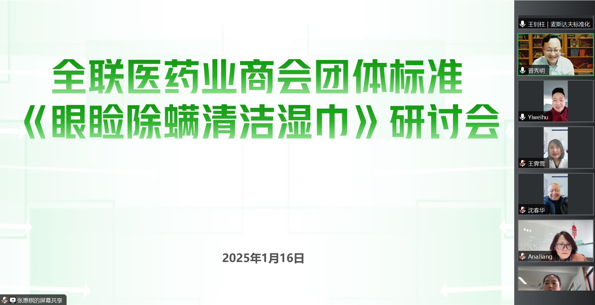 2025年1月16日,全聯(lián)醫(yī)藥業(yè)商會團(tuán)體標(biāo)準(zhǔn)《眼瞼除螨清潔濕巾》研討會以線上會議形式召開。浙江大學(xué)醫(yī)學(xué)院附屬第二醫(yī)院、泰州瞳衛(wèi)士眼健康科技有限公司、云南白藥集團(tuán)醫(yī)療科技合肥有限公司、浙江珍視明眼健康產(chǎn)業(yè)有限公司、上海瞳光閃亮健康科技有限公司、如期(深圳)生物科技有限公司、沈陽何氏眼產(chǎn)業(yè)集團(tuán)有限公司、泰州市藥品檢驗(yàn)院等標(biāo)準(zhǔn)起草組成員單位派員參會。會議由麥斯達(dá)夫標(biāo)準(zhǔn)化市場總監(jiān)、蘇州公司總經(jīng)理王釗柱主持。