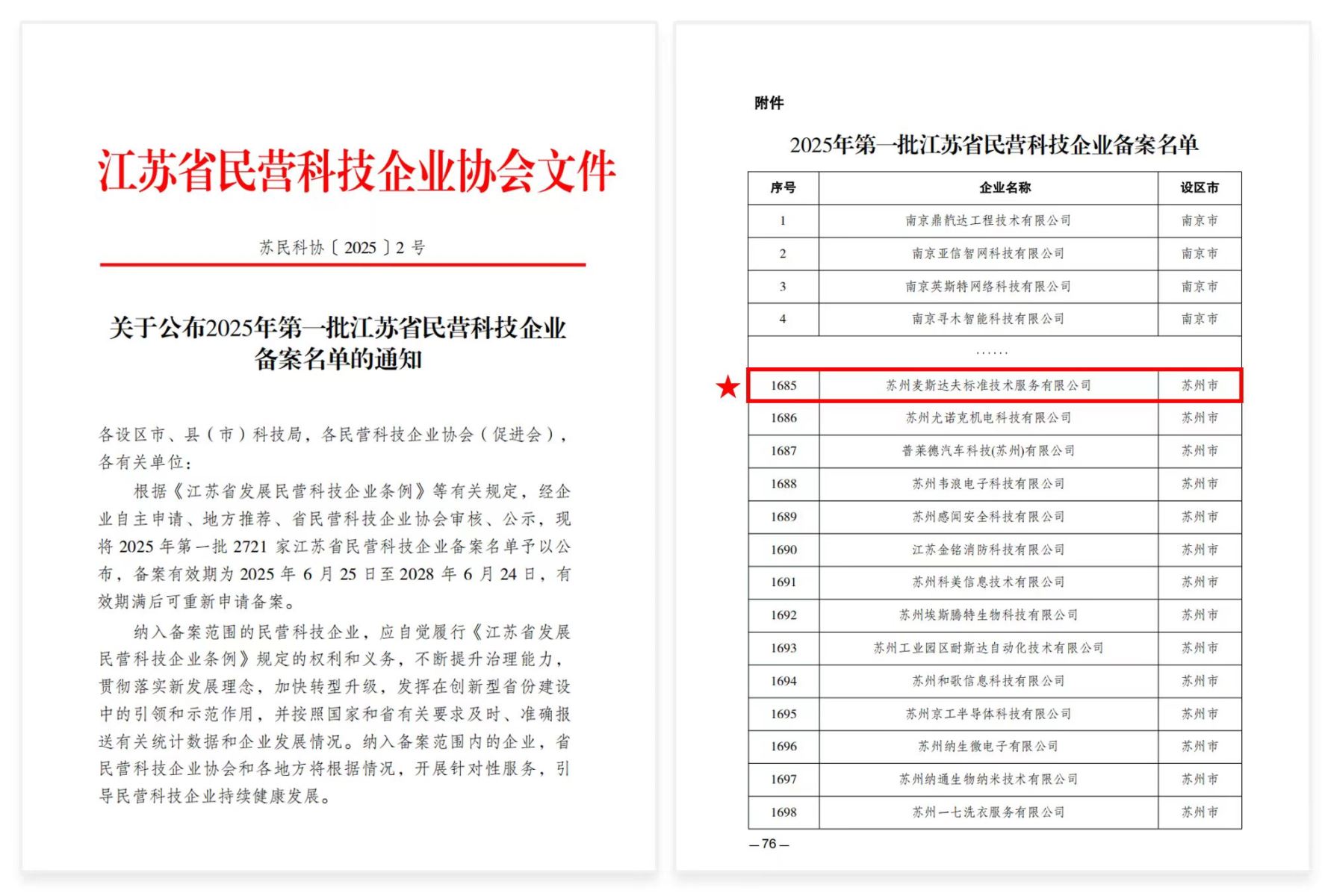 2025年6月25日,江蘇省民營科技企業(yè)協(xié)會正式公布了2025年第一批江蘇省民營科技企業(yè)備案名單。憑借在標準研究領域的持續(xù)創(chuàng)新與深厚積累,蘇州麥斯達夫標準技術服務有限公司成功入選,標志著其科技創(chuàng)新能力與發(fā)展?jié)摿Λ@得省級權(quán)威認可。
