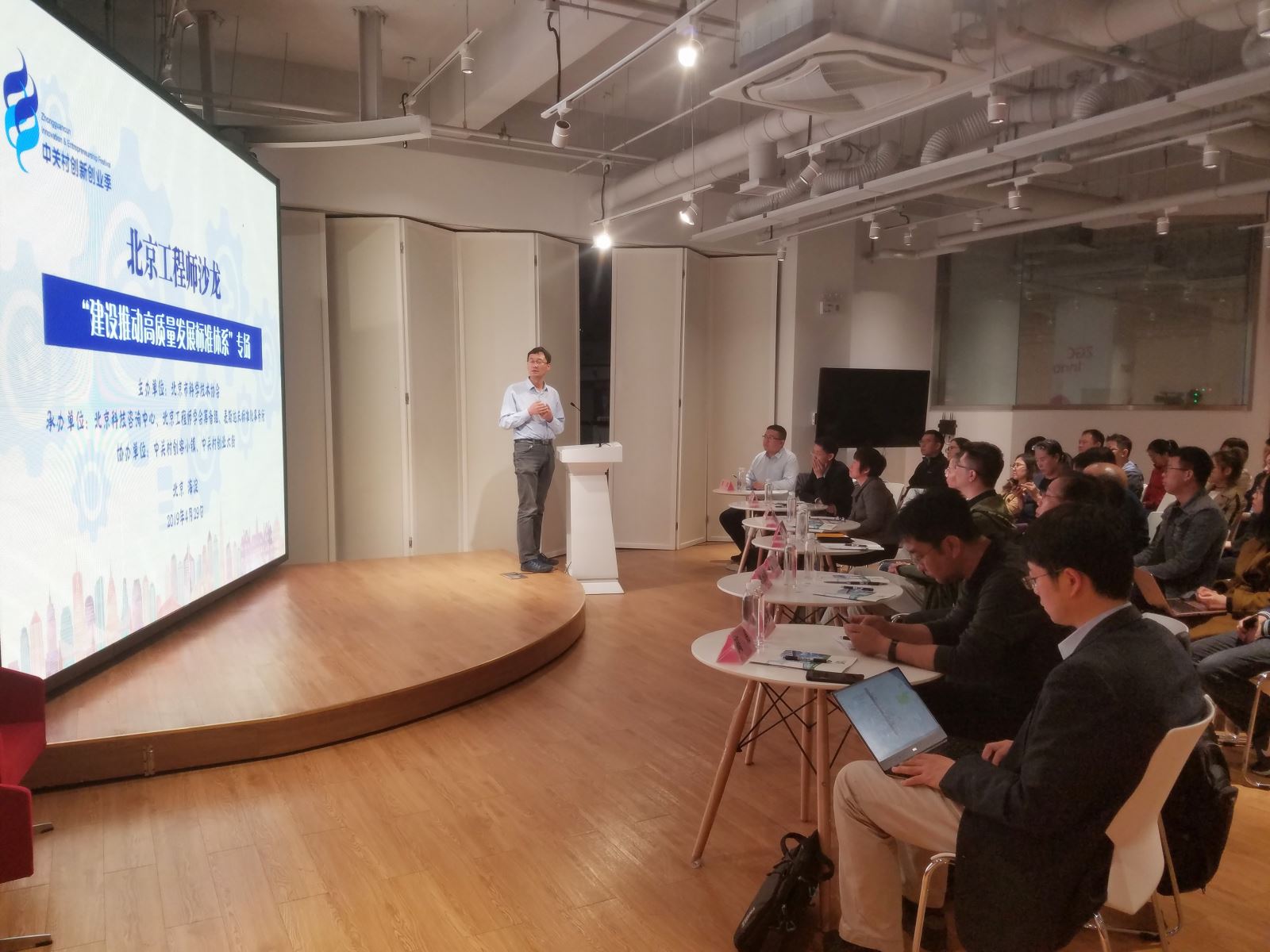 2019年4月29日,北京工程師沙龍第二期——“建設(shè)推動(dòng)高質(zhì)量發(fā)展標(biāo)準(zhǔn)體系”專(zhuān)場(chǎng)在海淀區(qū)中關(guān)村創(chuàng)客小鎮(zhèn)舉行。本次沙龍由北京市科協(xié)主辦,北京科技咨詢(xún)中心、北京工程師學(xué)會(huì)籌備組、麥斯達(dá)夫標(biāo)準(zhǔn)化事務(wù)所承辦,中關(guān)村創(chuàng)客小鎮(zhèn)、中關(guān)村創(chuàng)業(yè)大街協(xié)辦。本場(chǎng)沙龍是2019中關(guān)村創(chuàng)新創(chuàng)業(yè)季精彩系列活動(dòng)之一。北京科技咨詢(xún)中心副主任張海新、科技咨詢(xún)部副部長(zhǎng)袁潔,中關(guān)村創(chuàng)客小鎮(zhèn)技術(shù)總監(jiān)程清鴿、產(chǎn)品設(shè)計(jì)總監(jiān)李杰出席會(huì)議。沙龍由麥斯達(dá)夫標(biāo)準(zhǔn)化事務(wù)所首席執(zhí)行官鄭波主持。