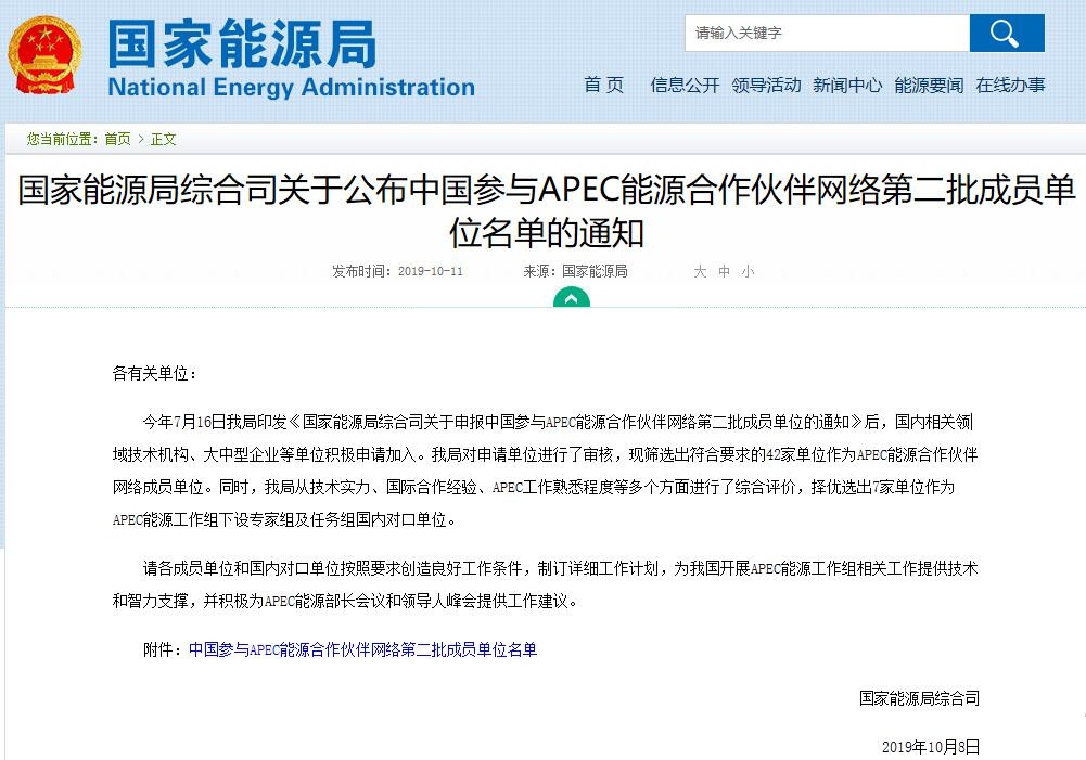 2019年7月16日,國(guó)家能源局印發(fā)《國(guó)家能源局綜合司關(guān)于申報(bào)中國(guó)參與APEC能源合作伙伴網(wǎng)絡(luò)第二批成員單位的通知》后,國(guó)內(nèi)相關(guān)領(lǐng)域技術(shù)機(jī)構(gòu)、大中型企業(yè)等單位積極申請(qǐng)加入。國(guó)家能源局對(duì)申請(qǐng)單位進(jìn)行了審核,現(xiàn)篩選出符合要求的42家單位作為APEC能源合作伙伴網(wǎng)絡(luò)成員單位。同時(shí),國(guó)家能源局從技術(shù)實(shí)力、國(guó)際合作經(jīng)驗(yàn)、APEC工作熟悉程度等多個(gè)方面進(jìn)行了綜合評(píng)價(jià),擇優(yōu)選出7家單位作為APEC能源工作組下設(shè)專家組及任務(wù)組國(guó)內(nèi)對(duì)口單位。