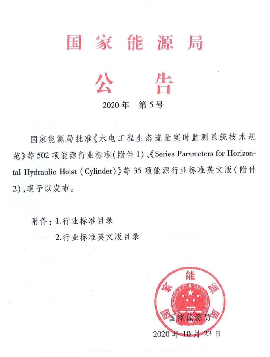 2020年10月28日,國家能源局發(fā)布2020年第5號公告,批準發(fā)布《水電工程生態(tài)流量實時監(jiān)測系統(tǒng)技術規(guī)范》等502項能源行業(yè)標準以及《Series Parameters for Horizontal Hydraulic Hoist(Cylinder)》等35項能源行業(yè)標準英文版。