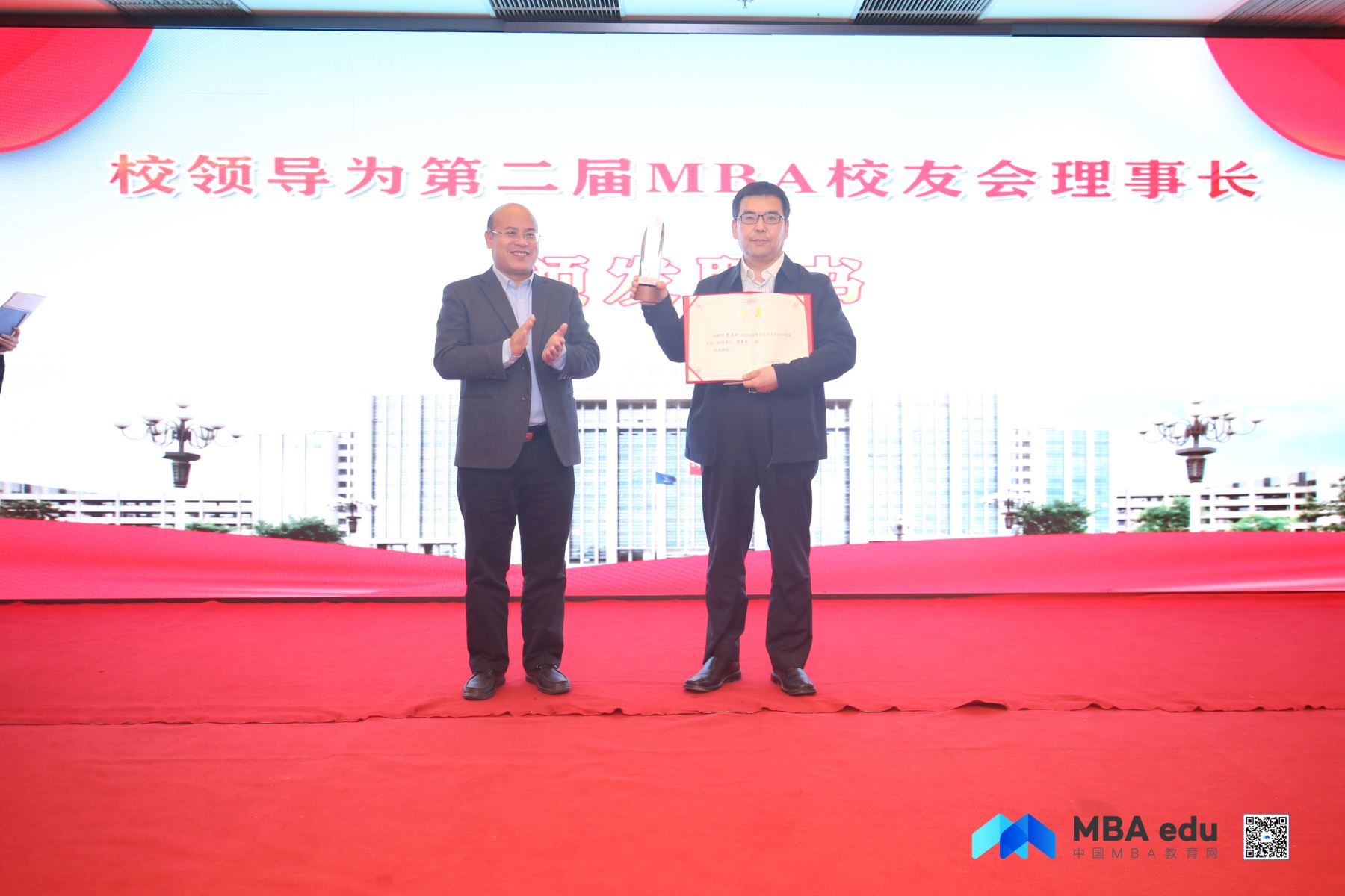 根據(jù)預備會議選舉投票,會議推舉經(jīng)濟與管理學院院長、MBA教育中心主任李彥斌擔任第二屆MBA校友會理事長。黃向軍為新任理事長頒發(fā)聘書。