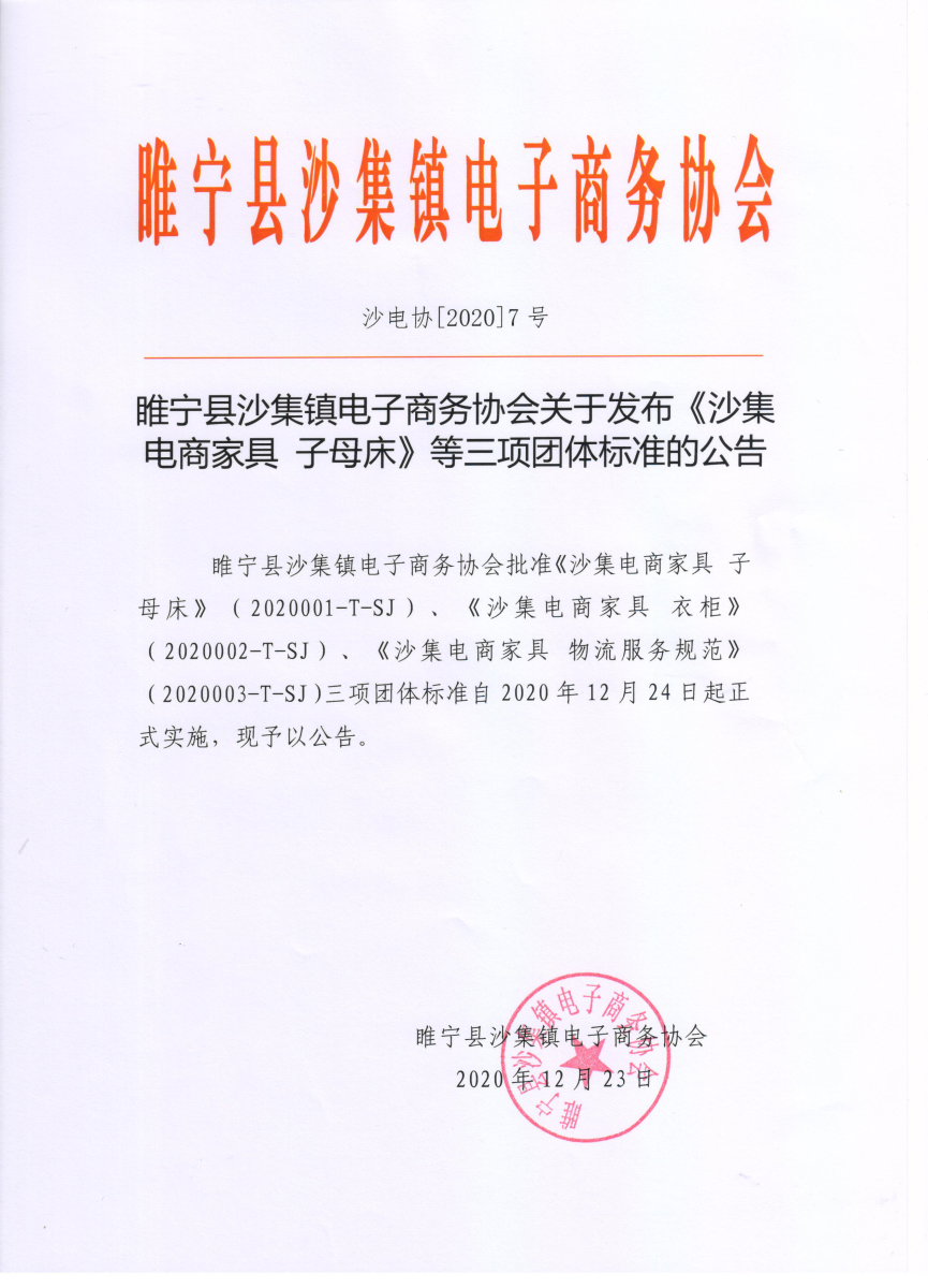 2020年12月23日,由麥斯達(dá)夫標(biāo)準(zhǔn)化事務(wù)所主導(dǎo)編制的《沙集電商家具 子母床》(2020001-T-SJ)、《沙集電商家具 衣柜》(2020002-T-SJ)、《沙集電商家具 物流服務(wù)規(guī)范》(2020003-T-SJ)三項(xiàng)團(tuán)體標(biāo)準(zhǔn)正式獲批發(fā)布。