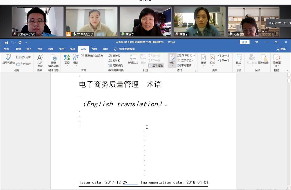 2021年2月4-5日,全國電子商務(wù)質(zhì)量管理標(biāo)準(zhǔn)化技術(shù)委員會(huì)(SAC/TC563)在杭州及線上組織召開《電子商務(wù)質(zhì)量管理 術(shù)語》等5項(xiàng)國家標(biāo)準(zhǔn)外文版審查會(huì)。來自中國物品編碼中心、中國標(biāo)準(zhǔn)化研究院、中國檢驗(yàn)檢疫科學(xué)研究院、中國計(jì)量大學(xué)、杭州市標(biāo)準(zhǔn)化研究院、麥斯達(dá)夫標(biāo)準(zhǔn)化事務(wù)所等單位的專家組成審查專家組。