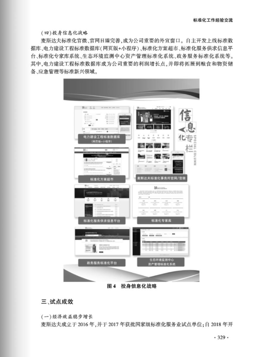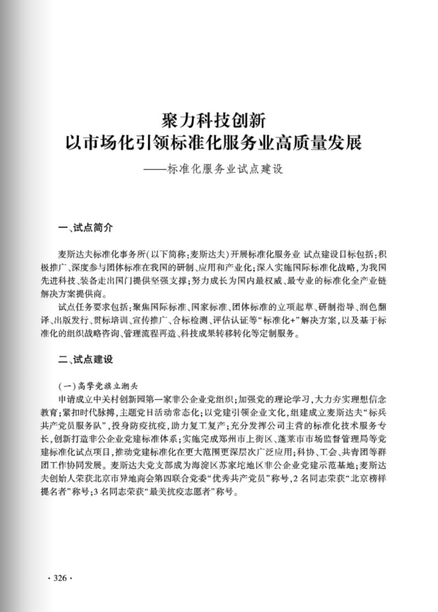 “聚力科技創(chuàng)新 以市場化引領(lǐng)標(biāo)準(zhǔn)化服務(wù)業(yè)高質(zhì)量發(fā)展”以麥斯達(dá)夫高分通過標(biāo)準(zhǔn)化服務(wù)業(yè)試點(diǎn)驗(yàn)收為基礎(chǔ),由試點(diǎn)簡介、試點(diǎn)建設(shè)、試點(diǎn)成效、承擔(dān)單位簡介四部分內(nèi)容組成。全文以圖文并茂的形式充分展示了麥斯達(dá)夫標(biāo)準(zhǔn)化服務(wù)業(yè)試點(diǎn)經(jīng)驗(yàn)和公司發(fā)展路徑以及試點(diǎn)期間取得的顯著經(jīng)濟(jì)、社會效益等內(nèi)容,標(biāo)志著麥斯達(dá)夫標(biāo)準(zhǔn)化事務(wù)所已經(jīng)在標(biāo)準(zhǔn)化服務(wù)業(yè)中成為佼佼者,也必然引領(lǐng)北京市乃至全國標(biāo)準(zhǔn)化服務(wù)業(yè)的發(fā)展。
