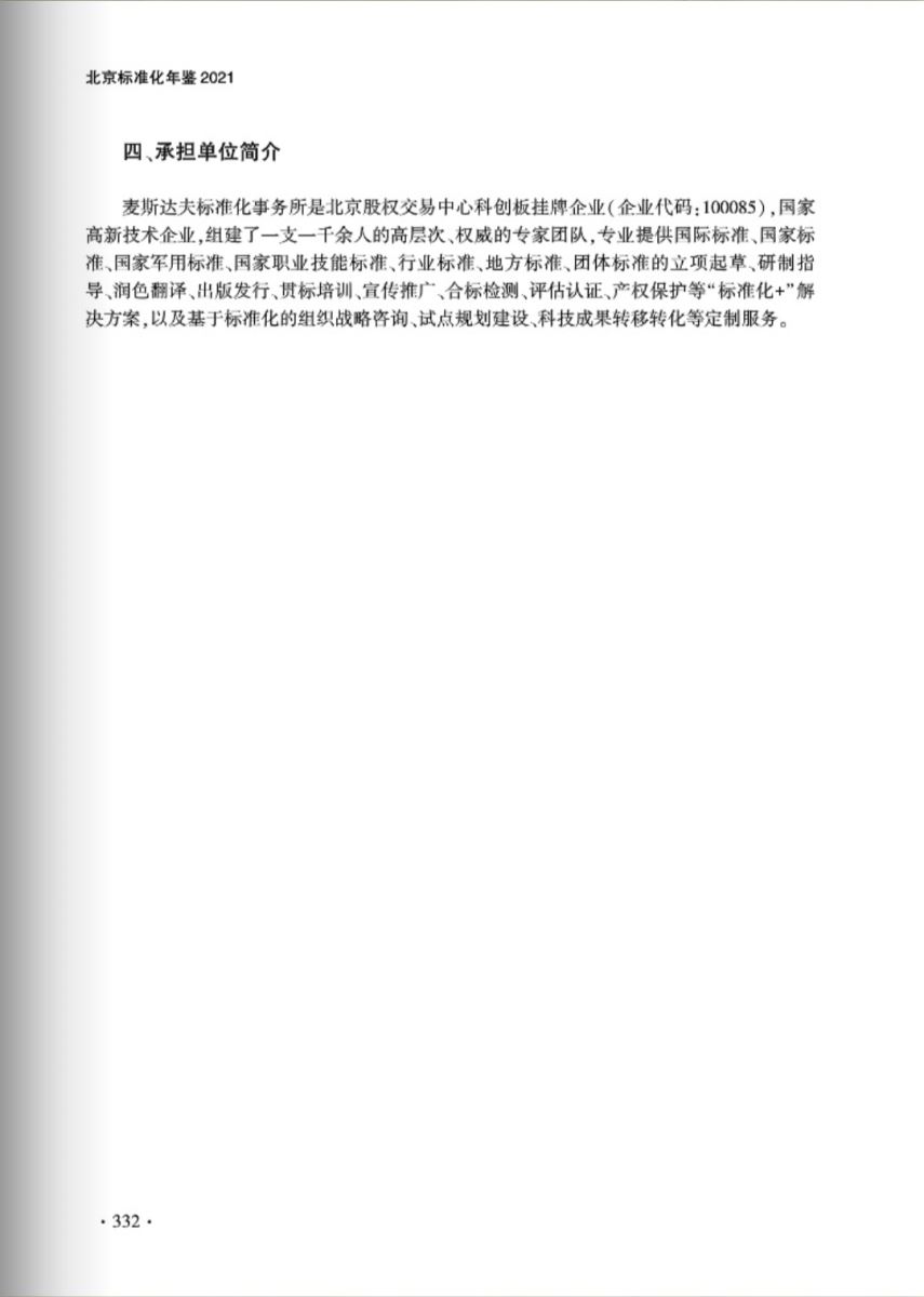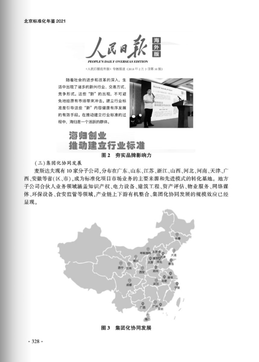 近日,由首都標(biāo)準(zhǔn)化委員會辦公室組織編纂的《北京標(biāo)準(zhǔn)化年鑒2021》正式發(fā)布。此書自2011年至今已連續(xù)出版9冊,是一部反映北京市標(biāo)準(zhǔn)化工作的綜合性資料工具書和史料文獻(xiàn)。麥斯達(dá)夫標(biāo)準(zhǔn)化服務(wù)業(yè)試點(diǎn)建設(shè)經(jīng)驗(yàn)“聚力科技創(chuàng)新 以市場化引領(lǐng)標(biāo)準(zhǔn)化服務(wù)業(yè)高質(zhì)量發(fā)展”成功入選。