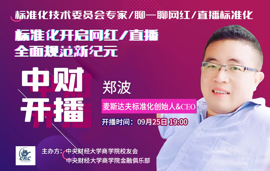 2021年9月25日,麥斯達夫標準化創(chuàng)始人、首席執(zhí)行官鄭波應邀為中央財經(jīng)大學作題為“標準化開啟網(wǎng)紅/直播全面規(guī)范新紀元”的直播講座。本次活動由中央財經(jīng)大學商學院校友會、中央財經(jīng)大學商學院金融俱樂部主辦。來自中央財經(jīng)大學的三十余位校友參加線上直播活動。
