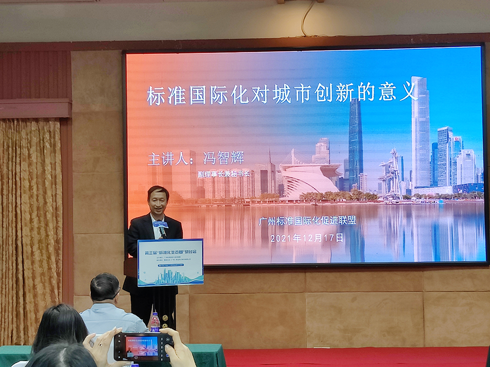 主題演講環(huán)節(jié),首先由廣州市標(biāo)準(zhǔn)化研究院副院長(zhǎng)馮智輝作《標(biāo)準(zhǔn)國(guó)際化對(duì)城市創(chuàng)新的意義》的主題報(bào)告。