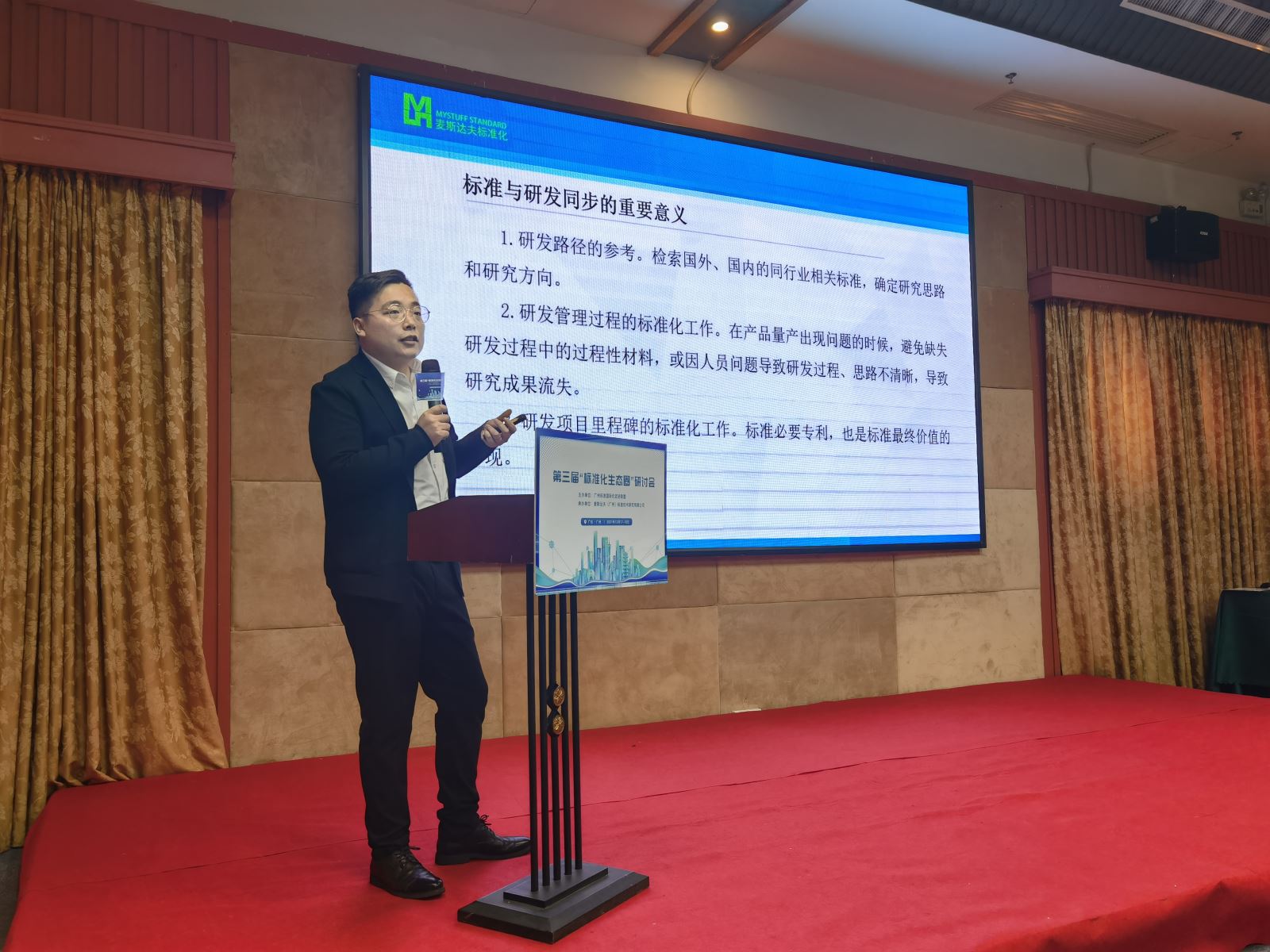麥斯達(dá)夫市場(chǎng)總監(jiān)王釗柱介紹了“標(biāo)準(zhǔn)與研發(fā)同步”。