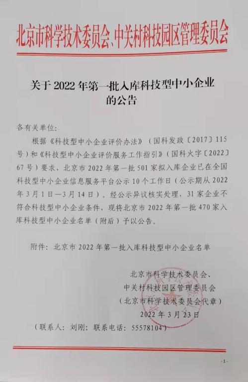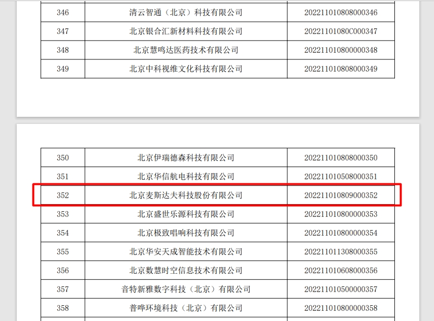 2022年3月23日,北京市科學(xué)技術(shù)委員會(huì)、中關(guān)村科技園區(qū)管理委員會(huì)發(fā)布《關(guān)于2022年第1批入庫科技型中小企業(yè)名單的公告》,共470家企業(yè)入圍,其中北京麥斯達(dá)夫科技股份有限公司成功位列其中。