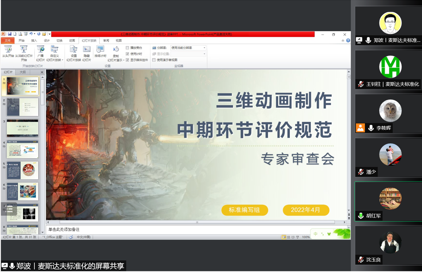 2022年4月14日,正值中國動畫百年之際,文化行業(yè)標準《三維動畫制作 中期環(huán)節(jié)評價規(guī)范》專家審查會以線上視頻會議形式召開。來自北京郵電大學(xué)、中國傳媒大學(xué)、中國標準化研究院、浙江中南卡通股份有限公司、全國動漫游戲產(chǎn)業(yè)標準化技術(shù)委員會的五名專家組成標準評審專家組。標準起草組成員單位北京麥斯達夫科技股份有限公司首席執(zhí)行官鄭波,北京靈魂石數(shù)字科技有限公司總經(jīng)理楊桂民、副總經(jīng)理丁文、運營總監(jiān)潘俊紹參加會議。會議由全國動漫游戲產(chǎn)業(yè)標準化技術(shù)委員會秘書處李筱暉主持。