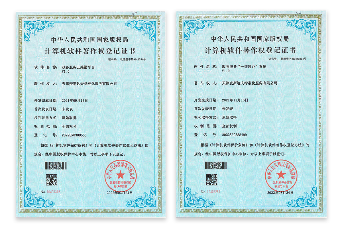 2022年5月16日,天津麥斯達(dá)夫標(biāo)準(zhǔn)化服務(wù)有限公司獲得兩項軟件著作權(quán)證書,“政務(wù)服務(wù)云踏勘平臺V1.0”“政務(wù)服務(wù)‘一證通辦’系統(tǒng)V1.0”。
