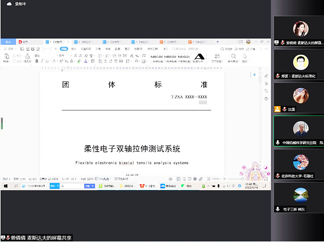 2022年6月14日,中關村標準化協(xié)會以線上會議形式召開中關村標準《柔性電子雙軸拉伸測試儀》《原位冷熱臺》專家審查會。來自中國機械科學研究總院、北京科技大學、中國電子科技集團公司第三研究所、北京市計量檢測科學研究院、賽迪集團等單位的專家組成標準評審專家組。標準主編單位北京中聚高科科技有限公司技術(shù)工程師張建亮參加會議并陳述答辯。