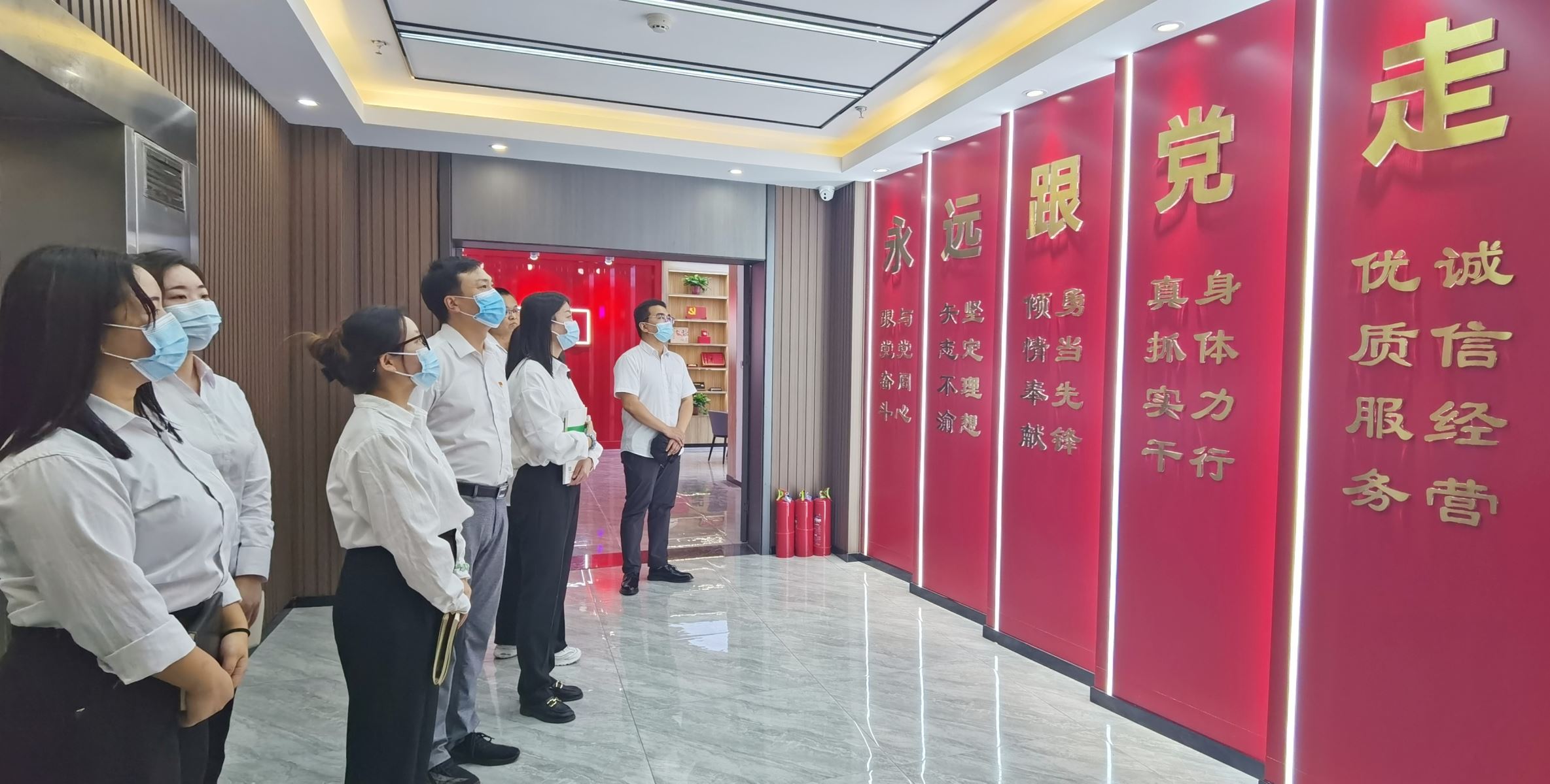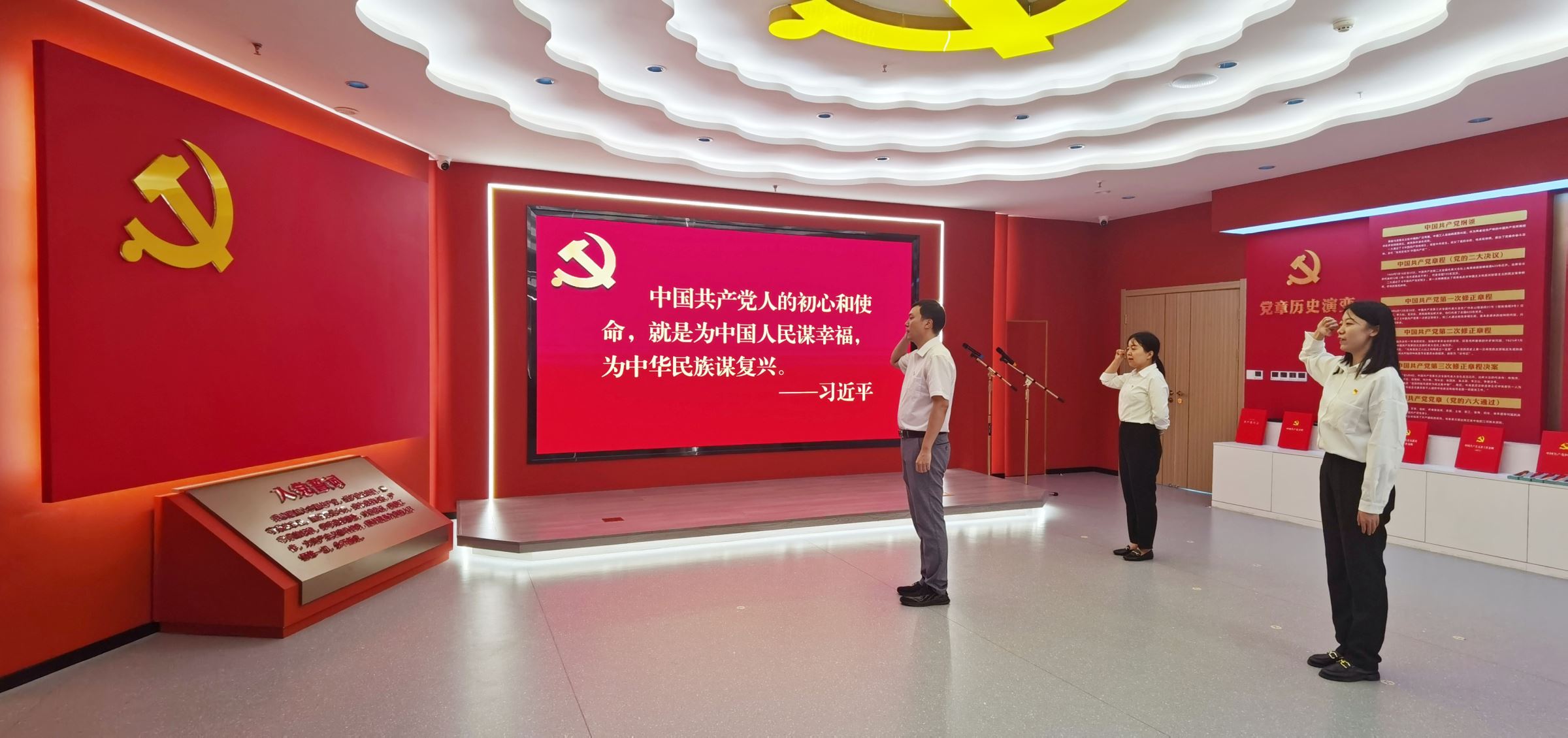 在“六有”黨員活動室,大家看到了按照“有場所、有設(shè)施、有標(biāo)志、有黨旗、有書報(bào)、有制度”標(biāo)準(zhǔn),打造的標(biāo)準(zhǔn)化、規(guī)范化的陣地樣板。在黨員宣誓大廳,講解員介紹了黨章、黨旗及入黨誓詞歷史演變過程。最后,在莊重嚴(yán)肅的入黨宣誓區(qū)域,黨支部副書記王超帶領(lǐng)公司駐晉黨員面對莊嚴(yán)的黨旗,重溫了入黨誓詞。