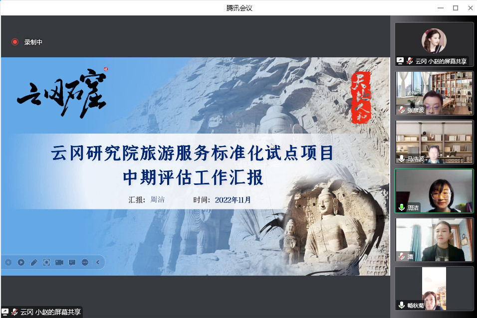 2022年11月29日,大同市云岡石窟研究院旅游服務標準化試點中期驗收評估會以網絡會議形式召開。山西省市場監(jiān)督管理局標準管理處處長王守業(yè)、二級調研員秦忠武帶隊,來自山西省社會科學院、山西省檢驗檢測中心、中國(山西)知識產權保護中心、山西省標準計量技術研究院等單位的專家組成評估專家組。云岡研究院黨委委員、文旅融合發(fā)展中心主任崔曉霞,大同市市場監(jiān)督管理局標準化科科長高峻峰、副科長卜隆,大同市文化和旅游標準化技術委員會秘書長王雪妮等出席會議。