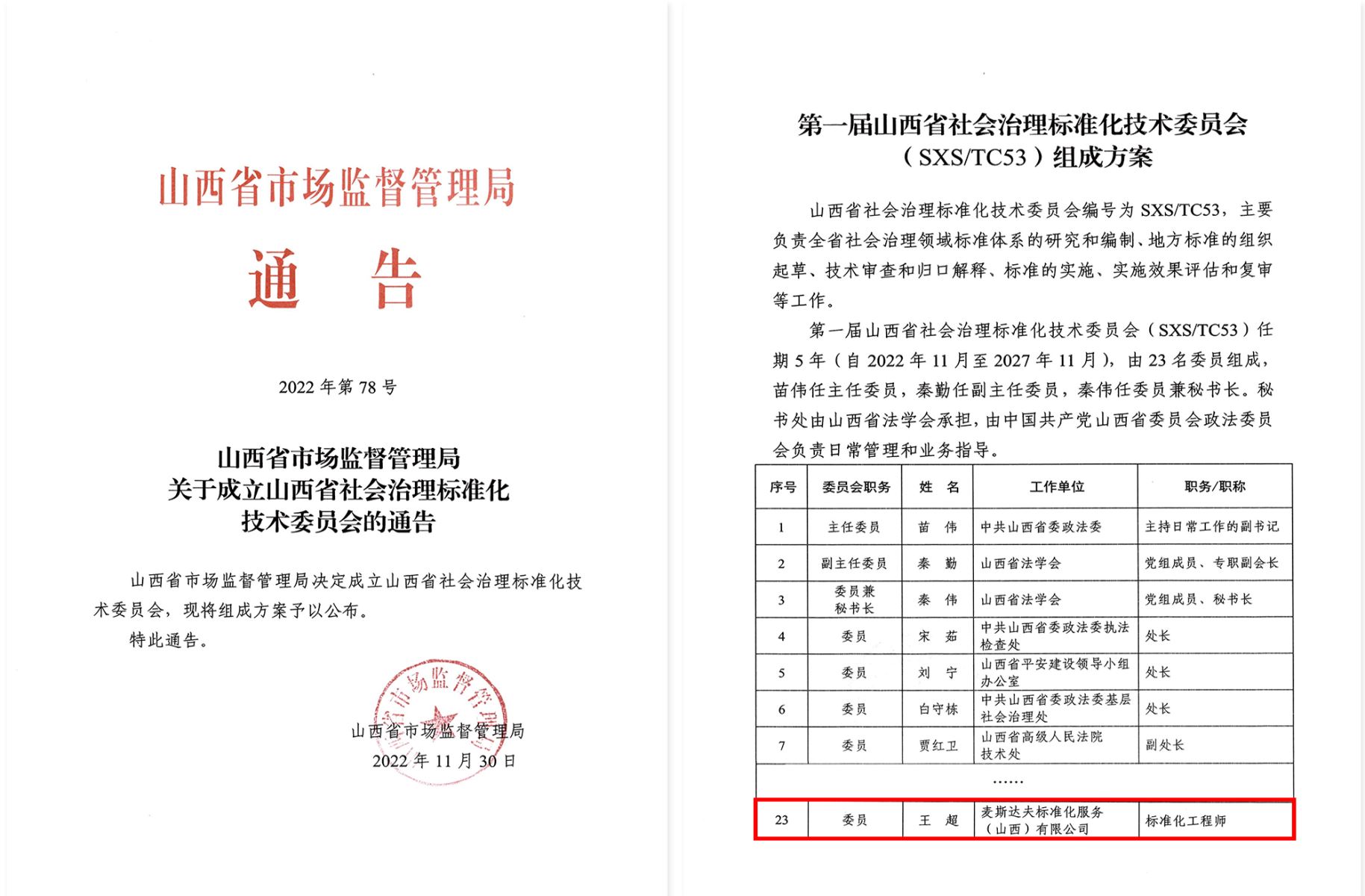 2022年11月30日,山西省市場監(jiān)督管理局決定成立山西省社會治理標(biāo)準(zhǔn)化技術(shù)委員會,并公布了組成方案。麥斯達(dá)夫標(biāo)準(zhǔn)化首席運(yùn)營官王超當(dāng)選第一屆山西省社會治理標(biāo)準(zhǔn)化技術(shù)委員會委員。