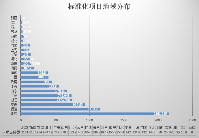 總體來看,北京和東部沿海省份由于經(jīng)濟(jì)比較發(fā)達(dá),接受新事物、新理念的能力更強(qiáng),標(biāo)準(zhǔn)化項(xiàng)目層出不窮,單個(gè)項(xiàng)目的金額相對(duì)較大,而中西部等欠發(fā)達(dá)地區(qū)的標(biāo)準(zhǔn)化項(xiàng)目相對(duì)較少,金額也偏小。