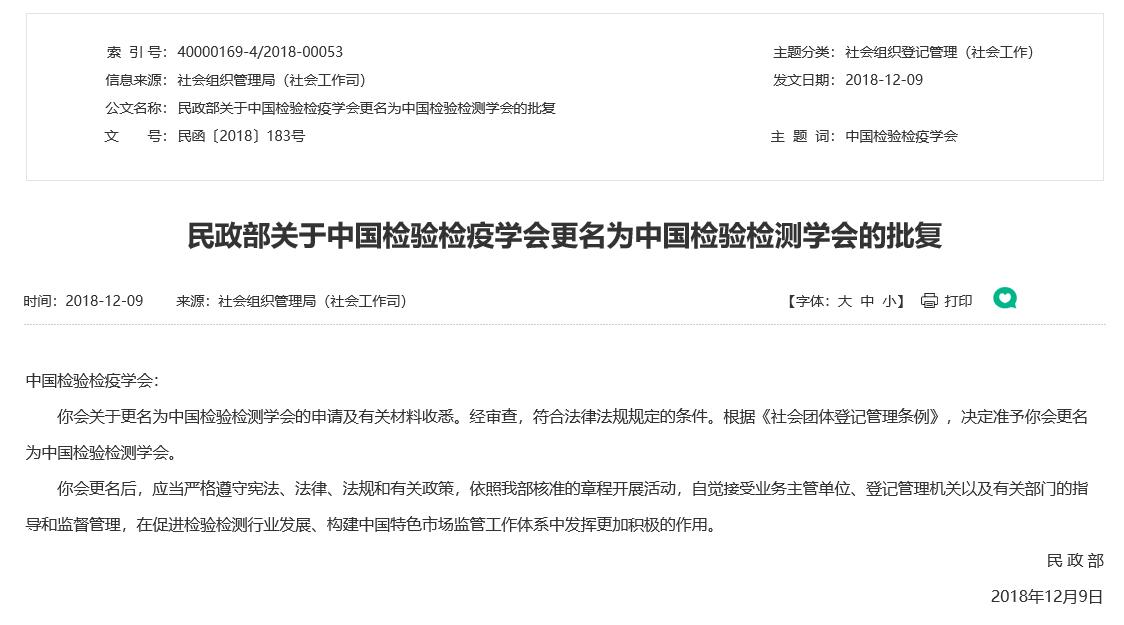 2018年12月9日,經(jīng)民政部批準(zhǔn),中國(guó)檢驗(yàn)檢疫學(xué)會(huì)更名為“中國(guó)檢驗(yàn)檢測(cè)學(xué)會(huì)”。
