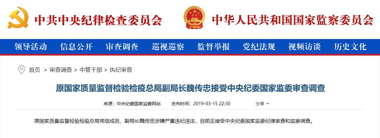中央紀(jì)委國(guó)家監(jiān)委網(wǎng)站2019年3月15日22點(diǎn)30分發(fā)布消息稱(chēng),“原國(guó)家質(zhì)量監(jiān)督檢驗(yàn)檢疫總局黨組成員、副局長(zhǎng)魏傳忠涉嫌嚴(yán)重違紀(jì)違法,目前正接受中央紀(jì)委國(guó)家監(jiān)委紀(jì)律審查和監(jiān)察調(diào)查。”