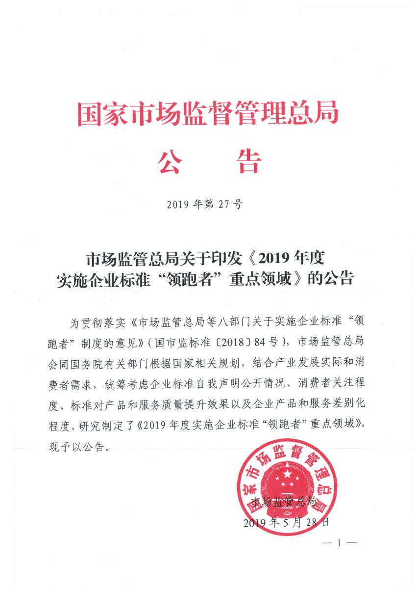 市場監(jiān)管總局關(guān)于印發(fā)《2019年度實施企業(yè)標(biāo)準(zhǔn)“領(lǐng)跑者”重點領(lǐng)域》的公告