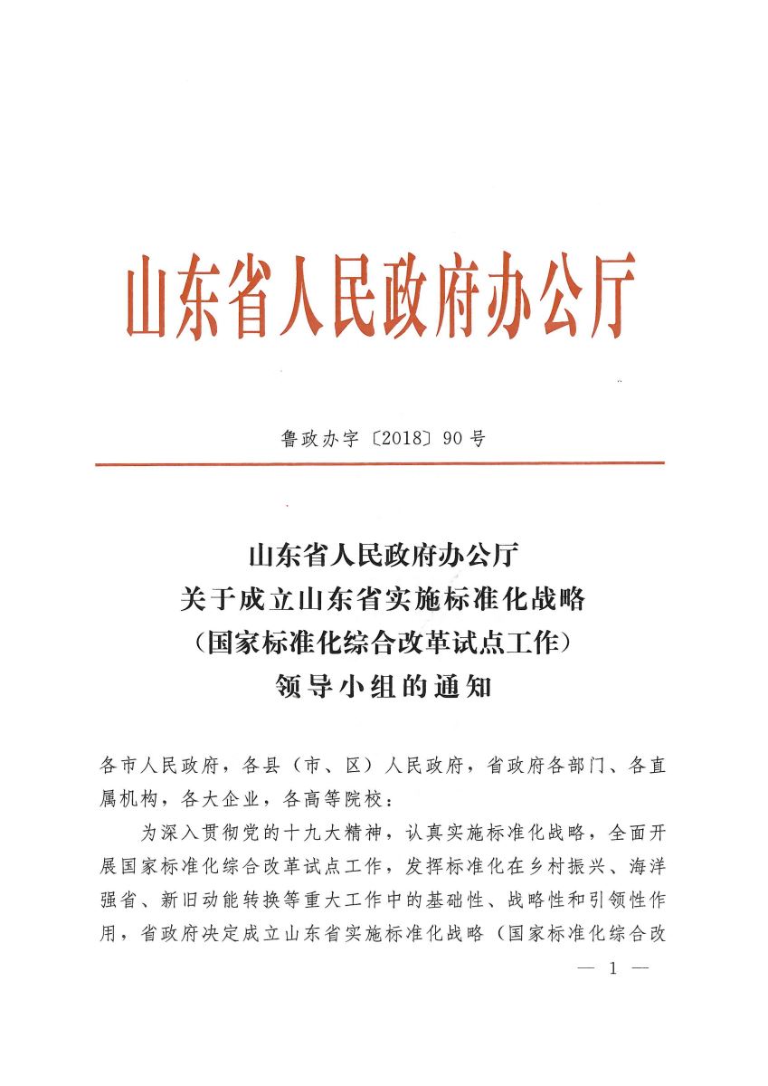 山東省人民政府辦公廳關(guān)于成立山東省實(shí)施標(biāo)準(zhǔn)化戰(zhàn)略(國家標(biāo)準(zhǔn)化綜合改革試點(diǎn)工作)領(lǐng)導(dǎo)小組的通知