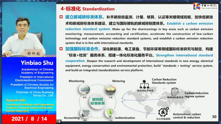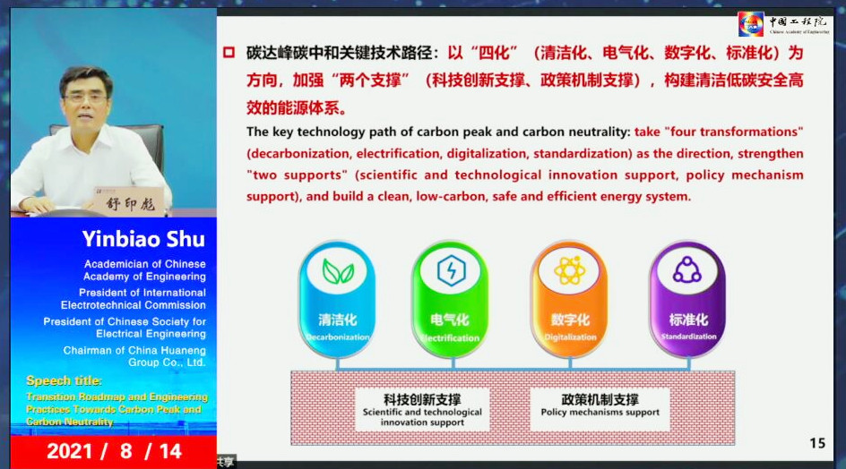 8月14日,在2021年中國(guó)工程院國(guó)際工程科技發(fā)展戰(zhàn)略高端論壇暨第六屆紫金論電國(guó)際學(xué)術(shù)研討會(huì)上,國(guó)際電工委員會(huì)(IEC)主席、中國(guó)電機(jī)工程學(xué)會(huì)理事長(zhǎng)、中國(guó)華能集團(tuán)有限公司董事長(zhǎng)舒印彪院士發(fā)表題為“碳達(dá)峰碳中和技術(shù)路徑及實(shí)踐探討”的主旨報(bào)告。