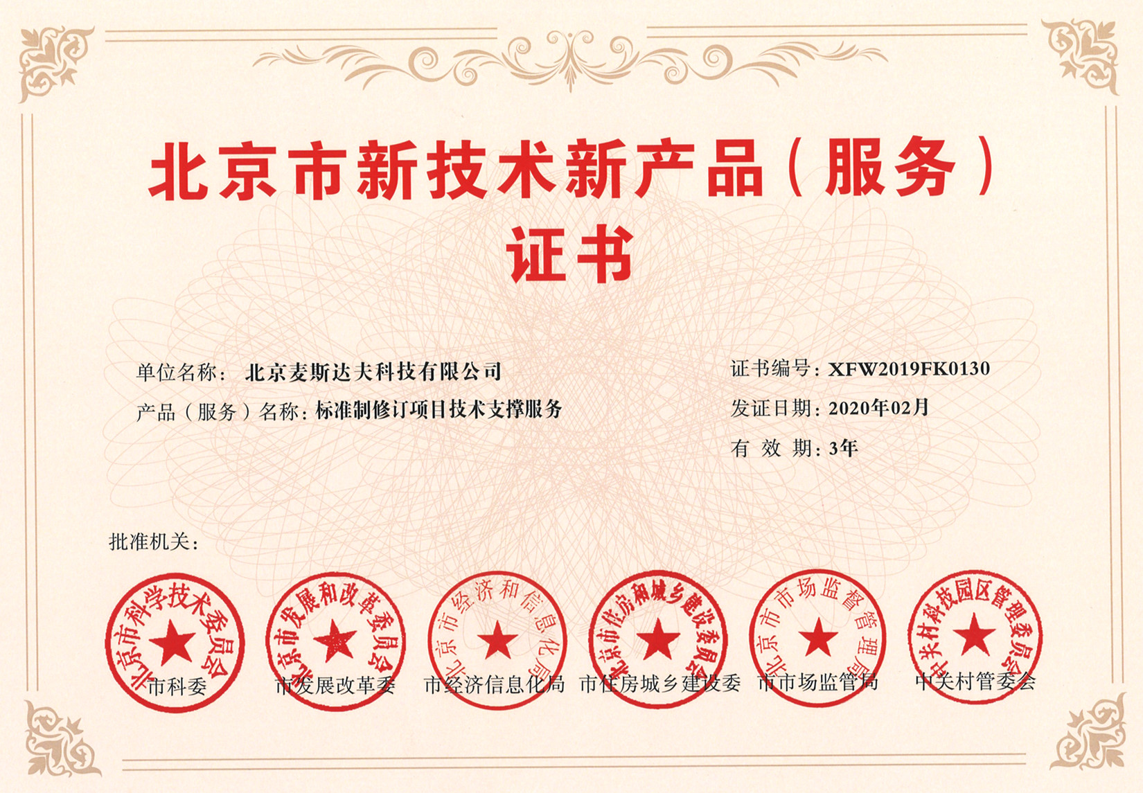 麥斯達夫標(biāo)準(zhǔn)化事務(wù)所申報的“標(biāo)準(zhǔn)制修訂項目技術(shù)支撐服務(wù)”成功入選第十一批北京市新技術(shù)新產(chǎn)品(服務(wù))。