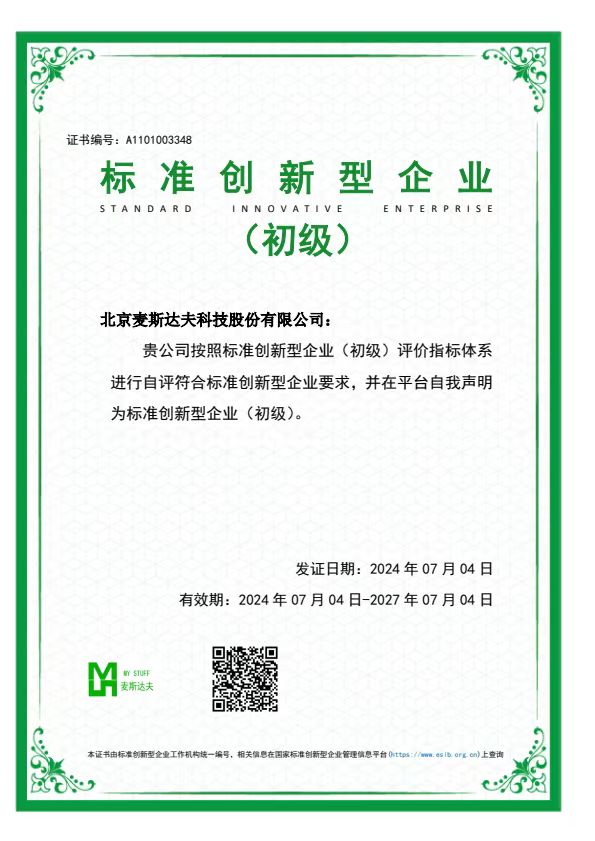 北京麥斯達夫科技股份有限公司獲評標(biāo)準(zhǔn)創(chuàng)新型企業(yè)