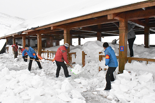 長(zhǎng)白山冬季漫長(zhǎng),雪量極大,西景區(qū)各候車(chē)回廊經(jīng)過(guò)一冬天風(fēng)雪“洗禮”,積雪已超過(guò)一人多高。為迎接“五一”小長(zhǎng)假,確保旅游安全有序,景區(qū)運(yùn)營(yíng)三部抽調(diào)經(jīng)理級(jí)管理人員、調(diào)度員、駕駛員共計(jì)20余人,組建清雪專(zhuān)班。專(zhuān)班人員分工協(xié)作,一組負(fù)責(zé)拴好安全繩推落棚頂積雪,另一組一鍬鍬鏟除積雪,汗珠常常掛滿(mǎn)額頭,濕透棉衣。隊(duì)員們起早貪黑、加足干勁、就地進(jìn)餐,他們既承擔(dān)起高強(qiáng)度作業(yè),又承受著積雪反射紫外線對(duì)皮膚造成的傷害,經(jīng)過(guò)一周“浴雪奮戰(zhàn)”,王池、峽谷、換乘和主峰等景點(diǎn)候車(chē)回廊積雪已全部清理完畢。